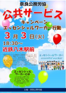 3月3日、近鉄八木駅前にて公共サービスキャンペーン街宣 2026.01.26 地域公共サービスの職場は人員削減が続いており、担う業務が増大、過重になっている一方で処遇は低く抑えられています。しかし、住民の皆さんにとって、なくてはならい公共サービスを止めるわけにはいきません。働く者の処遇の改善やサービス提供のための十分な人やお金の確保が、皆さんの命とくらしを守ることにつながります。公共サービスキャンペーンでは、公共サービスの必要性・重要性を訴えるため、全国でアピール行動を実施しています。